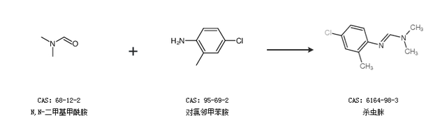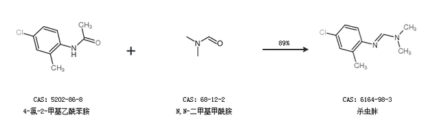 1.通过4-氯-2-甲基乙酰苯胺和N,N-二甲基甲酰胺合成杀虫脒,收率约89%;
