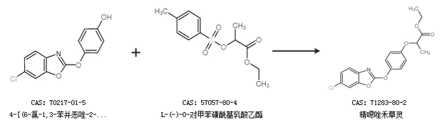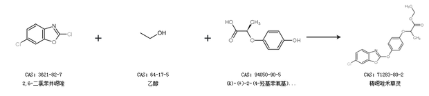 英文别名 ethyl (R)-2-[4-(6-chlorobenzoxazol-2-yloxy)phenoxy]propionate;ethyl (2R)-2-[4-[(6-chloro-2-benzoxazolyl)oxy]phenoxy]propanoate;ethyl (2R)-2-{4-[(6-chloro-1,3-benzoxazol-2-yl)oxy]phenoxy}propanoate;ethyl (R)-2-[4-(6-chloro-1,3-benzoxazol-2-yloxy)phenoxy]propionate;ethyl (2R)-2-[4-[(6-chloro-1,3-benzoxazol-2-yl)oxy]phenoxy]propanoate;Ethyl (2R)-(+)-2-[4-(6-chlorobenzoxazol-2-yloxy)phenoxy]propionate;