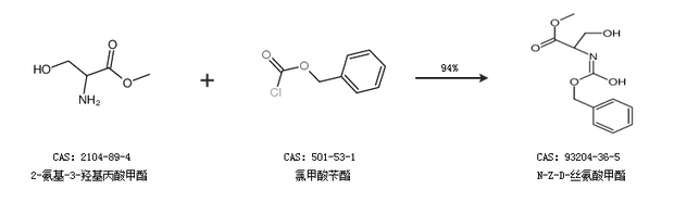 2.通过2-氨基-3-羟基丙酸甲酯和氯甲酸苄酯合成N-Z-D-丝氨酸甲酯,收率约94%;