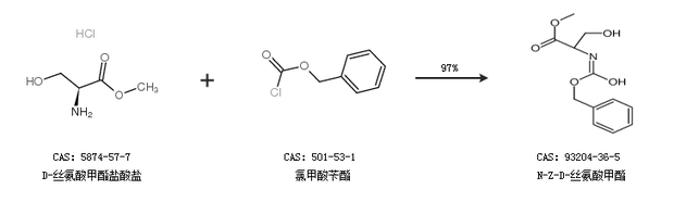 1.通过D-丝氨酸甲酯盐酸盐和氯甲酸苄酯合成N-Z-D-丝氨酸甲酯,收率约97%;