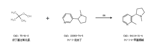 2.通过叔丁基过氧化氢和(+/-)-尼古丁合成(+/-)-2-甲基烟碱,收率约8%;