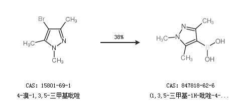 1.通过4-溴-1,3,5-三甲基吡唑合成(1,3,5-三甲基-1H-吡唑-4-基)硼酸,收率约38%;