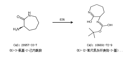 2.通过(R)-3-氨基-2-己内酰胺合成(R)-(2-氧代氮杂环庚烷-3-基)氨基甲酸叔丁酯,收率约83%;