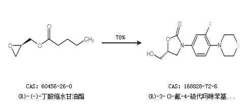 1.通过(R)-(-)-丁酸缩水甘油酯合成(R)-3-(3-氟-4-硫代吗啉苯基)-5-(羟基甲基)噁唑啉-2-酮,收率约78%;