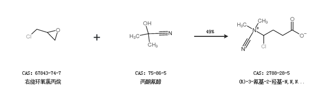 1.通过右旋环氧氯丙烷和丙酮氰醇合成(R)-3-氰基-2-羟基-N,N,N-三甲基-1-丙铵氯化物,收率约49%;