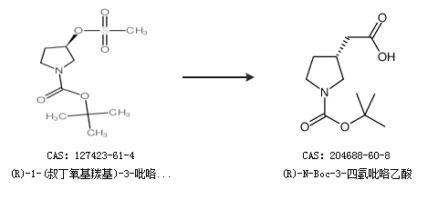 1.通过(R)-1-(叔丁氧基羰基)-3-吡咯烷-甲磺酸酯合成(R)-N-Boc-3-四氢吡咯乙酸