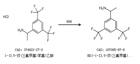 1.通过1-(3,5-双(三氟甲基)苯基)乙胺合成(RS)-1-[3,5-双(三氟甲基)苯基]乙胺,收率约99%;