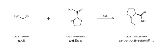 1.通过溴乙烷和L-脯氨酰胺合成(S)-(-)-1-乙基-2-吡咯烷甲酰胺,收率约65%;
