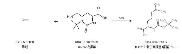 2.通过甲醛和Boc-L-鸟氨酸合成(S)-2-[(叔丁氧羰基)氨基]-5-(二甲基氨基)戊酸,收率约58%;