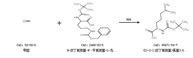 1.通过甲醛和N-叔丁氧羰基-N''-苄氧羰基-L-鸟氨酸合成(S)-2-[(叔丁氧羰基)氨基]-5-(二甲基氨基)戊酸,收率约99%;