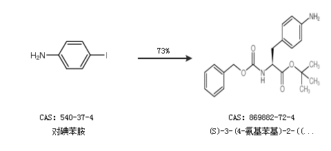 2.通过对碘苯胺合成(S)-3-(4-氨基苯基)-2-(((苄氧基)羰基)氨基)丙酸叔丁酯,收率约73%;