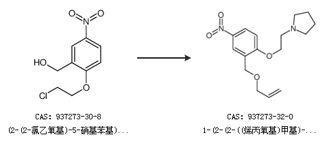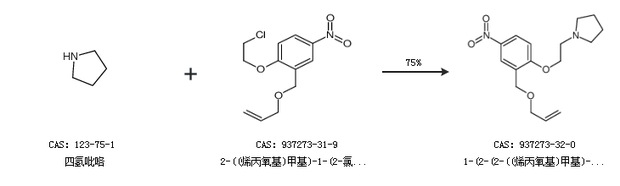 1.通过四氢吡咯和2-((烯丙氧基)甲基)-1-(2-氯乙氧基)-4-硝基苯合成1-(2-(2-((烯丙氧基)甲基)-4-硝基苯氧基)乙基)吡咯烷,收率约75%;