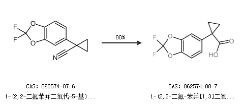 1.通过1-(2,2-二氟苯并二氧代-5-基)环丙烷甲腈合成1-(2,2-二氟-苯并[1,3]二氧代l-5-基)-环丙烷羧酸,收率约80%;