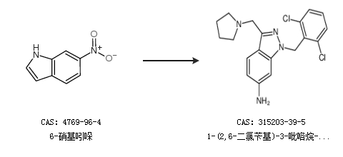 1.通过6-硝基吲哚合成1-(2,6-二氯苄基)-3-吡咯烷-1-甲基-1H-吲唑-6-胺