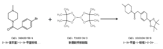 1.通过2-(4-溴苯基)-1-(4-甲基哌嗪-1-基)乙酮和联硼酸频那醇酯合成1-(4-甲基-1-哌嗪)-2-[4-(4,4,5,5-四甲基-1,3,2-二噁硼烷-2-基)苯基]-乙酮
