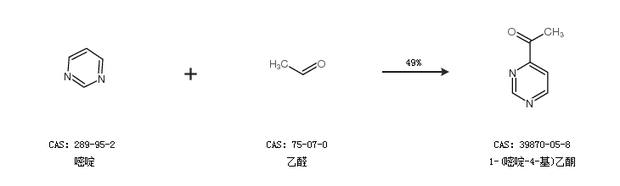 1.通过嘧啶和乙醛合成1-(嘧啶-4-基)乙酮,收率约49%;