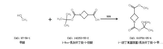 1.通过甲醇和1-Boc-氮杂环丁烷-3-羧酸合成1-(叔丁氧基羰基)氮杂环丁烷-3-甲酸甲酯,收率约99%;