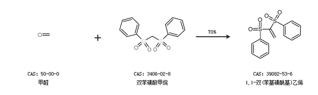 1.通过甲醛和双苯磺酸甲烷合成1,1-双(苯基磺酰基)乙烯,收率约70%;