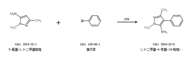 1.通过5-氨基-1,3-二甲基吡唑和溴代苯合成1,3-二甲基-4-苯基-1H-吡唑-5-胺,收率约20%;
