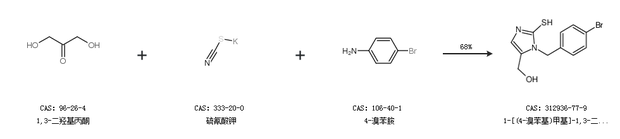 2.通过1,3-二羟基丙酮二聚体、硫氰酸钾和4-溴苄胺盐酸盐合成1-[(4-溴苯基)甲基]-1,3-二氢-5-(羟基甲基)-2H-咪唑-2-硫酮,收率约87%;