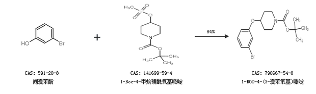 1.通过间溴苯酚和1-Boc-4-甲烷磺酰氧基哌啶合成1-BOC-4-(3-溴苯氧基)哌啶,收率约84%;