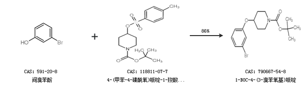 2.通过间溴苯酚和4-(甲苯-4-磺酰氧)哌啶-1-羧酸叔丁酯合成1-BOC-4-(3-溴苯氧基)哌啶,收率约86%;