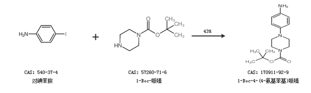 2.通过对碘苯胺和1-Boc-哌嗪合成1-Boc-4-(4-氨基苯基)哌嗪,收率约43%;