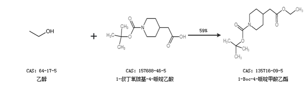2.通过乙醇和1-叔丁氧羰基-4-哌啶乙酸合成1-Boc-4-哌啶甲酸乙酯,收率约59%;