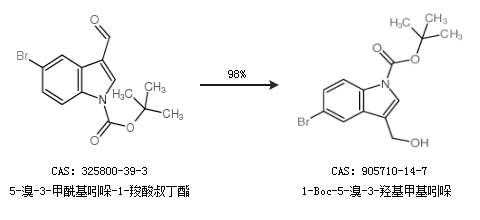 1.通过5-溴-3-甲酰基吲哚-1-羧酸叔丁酯合成1-Boc-5-溴-3-羟基甲基吲哚,收率约98%;
