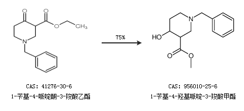 2.通过1-苄基-4-哌啶酮-3-羧酸乙酯合成1-苄基-4-羟基哌啶-3-羧酸甲酯,收率约75%;