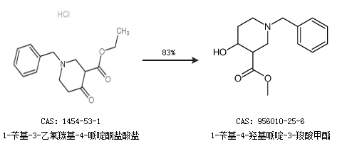 1.通过1-苄基-3-乙氧羰基-4-哌啶酮盐酸盐合成1-苄基-4-羟基哌啶-3-羧酸甲酯,收率约83%;