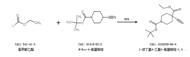 1.通过氯甲酸乙酯和N-Boc-4-氰基哌啶合成1-叔丁基4-乙基4-氰基哌啶-1,4-二羧酸,收率约90%;
