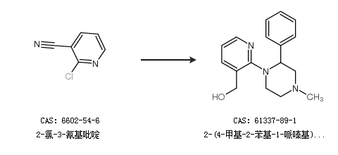 1.通过1-(3-氰基吡啶-2)-2-苯基-4-甲基哌嗪合成2-(4-甲基-2-苯基-1-哌嗪基)-3-吡啶甲醇,收率约21%;