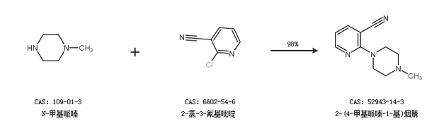 1.通过N-甲基哌嗪和2-氯-3-氰基吡啶合成2-(4-甲基哌嗪-1-基)烟腈,收率约98%;