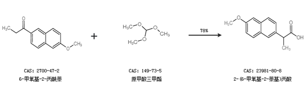 2.通过6-甲氧基-2-丙酰萘和原甲酸三甲酯合成2-(6-甲氧基-2-萘基)丙酸,收率约78%;