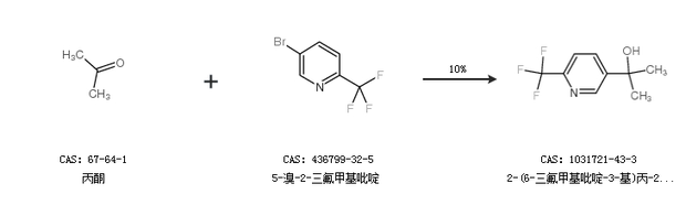 2.通过丙酮和5-溴-2-三氟甲基吡啶合成2-(6-三氟甲基吡啶-3-基)丙-2-醇,收率约10%;