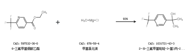 1.通过6-三氟甲基烟酸乙酯和甲基氯化镁合成2-(6-三氟甲基吡啶-3-基)丙-2-醇,收率约93%;