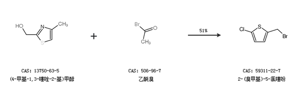 2.通过(4-甲基-1,3-噻唑-2-基)甲醇和乙酰溴合成2-(溴甲基)-5-氯噻吩,收率约51%;