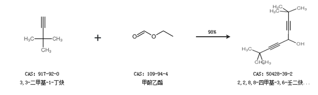 1.通过3,3-二甲基-1-丁炔和甲酸乙酯合成2,2,8,8-四甲基-3,6-壬二炔-5-醇,收率约98%;
