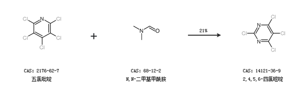 2.通过五氯吡啶和N,N-二甲基甲酰胺合成2,4,5,6-四氯嘧啶,收率约21%;