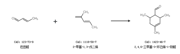 1.通过巴豆醛和2-甲基-1,3-戊二烯合成2,4,6-三甲基-3-环己烯-1-羧醛