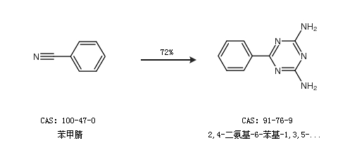 2.通过苯甲腈合成2,4-二氨基-6-苯基-1,3,5-三嗪,收率约72%;
