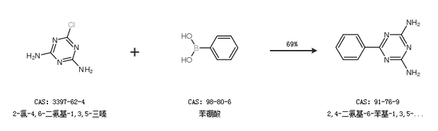 1.通过2-氯-4,6-二氨基-1,3,5-三嗪和苯硼酸合成2,4-二氨基-6-苯基-1,3,5-三嗪,收率约69%;