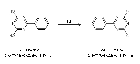 2.通过2,4-二羟基-6-苯基-1,3,5-三嗪合成2,4-二氯-6-苯基-1,3,5-三嗪,收率约84%;
