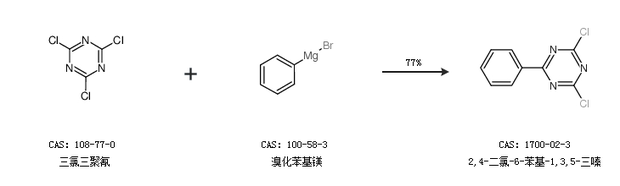 1.通过三氯三聚氰和溴化苯基镁合成2,4-二氯-6-苯基-1,3,5-三嗪,收率约77%;