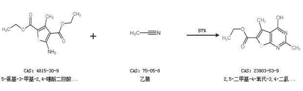 1.通过5-氨基-3-甲基-2,4-噻酚二羧酸二乙酯和乙腈合成2,5-二甲基-4-氧代-3,4-二氢-噻吩并[2,3-d]嘧啶-6-羧酸乙酯,收率约87%;