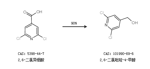 1.通过2,6-二氯异烟酸合成2,6-二氯吡啶-4-甲醇,收率约90%;