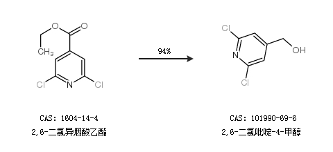 2.通过2,6-二氯异烟酸乙酯合成2,6-二氯吡啶-4-甲醇,收率约94%;