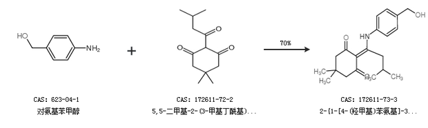 1.通过对氨基苯甲醇和5,5-二甲基-2-(3-甲基丁酰基)-1,3-环己二酮合成2-{1-[4-(羟甲基)苯氨基]-3-甲基亚丁基}-5,5-二甲基-1,3-环己二酮,收率约70%;