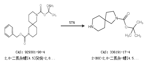 1.通过2,8-二氮杂螺[4.5]癸烷-2,8-二羧酸, 2-(1,1-二甲基乙基) 8-(苯基甲基)酯合成2-BOC-2,8-二氮杂-螺[4.5]癸烷,收率约57%;